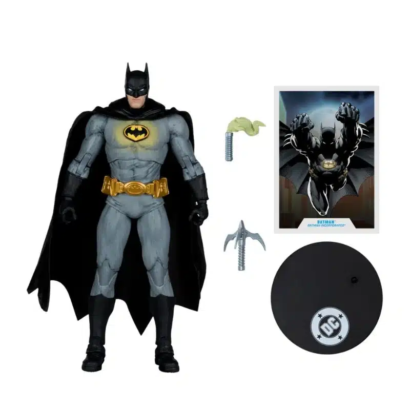 Figura prikazuje Batmana u prepoznatljivom sivom kostimu s crnim plaštom i žutim simbolom na prsima. Uz figuru dolaze dodatni dodaci poput bataranga i efekata, kao i kolekcionarska kartica.