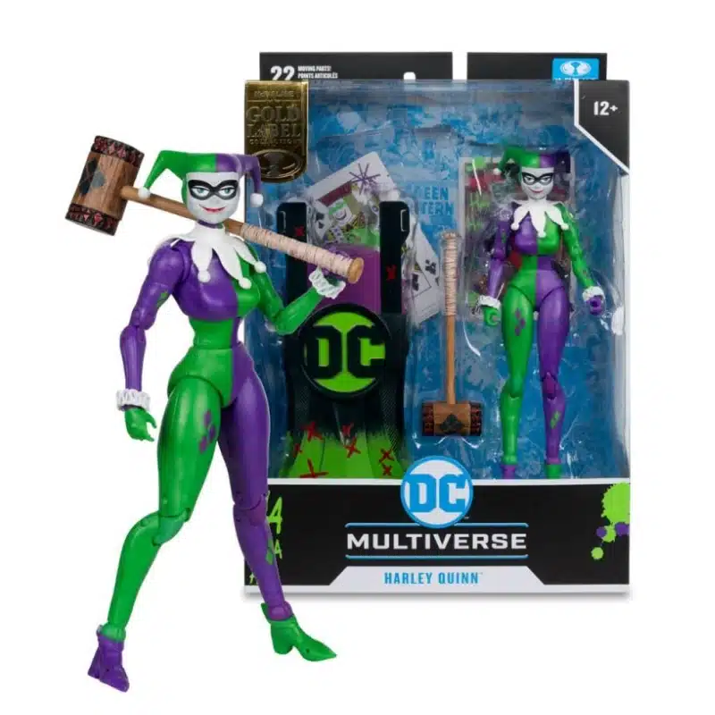 Akcijska figura visine 18 cm prikazuje Harley Quinn u jedinstvenom dizajnu koji kombinira njezin prepoznatljiv izgled s karakterističnim elementima Jokerovog stila. Figura je izrađena od visokokvalitetne PVC plastike i pažljivo oslikana kako bi se istaknuli detalji njezine odjeće, lica i opreme. Jedna od ključnih značajki ove figure je njezina artikulacija koja omogućava različite akcijske poze, čineći je idealnom za izlaganje ili rekreiranje scena iz stripova i filmova.