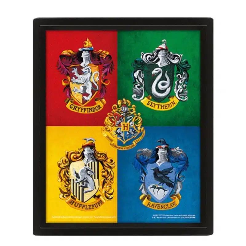 Harry Potter 3D slika s grbovima svih Hogwarts kuća. Idealna dekoracija za fanove.