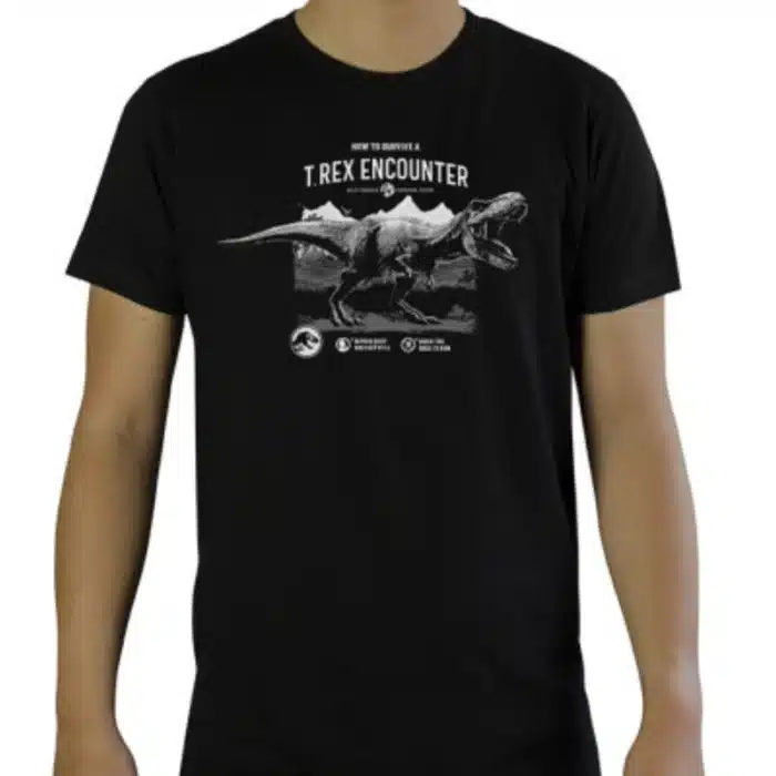 Unesi dozu avanture u svoj stil uz Jurassic World majicu kratkih rukava inspiriranu svijetom dinosaura. Ova crna majica donosi upečatljiv prikaz T-Rexa u dinamičnoj pozi, uz dizajn koji podsjeća na vodič za preživljavanje u divljini.