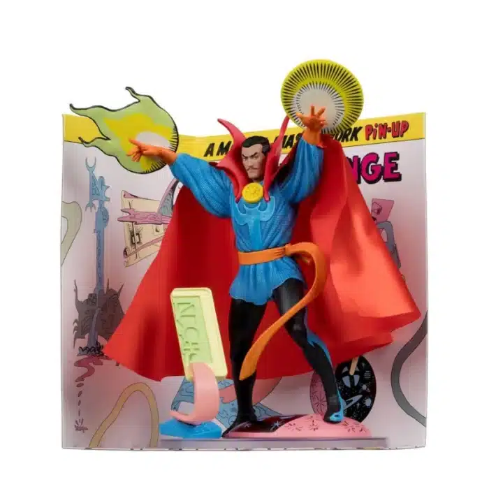 Ova figura predstavlja Doctor Strangea u klasičnom kostimu s naglašenim elementima poput crvenog plašta i magičnih efekata. Kompozicija je oblikovana kao scena iz stripa, s grafičkom pozadinom i dekorativnim elementima koji pojačavaju vizualni identitet lika.