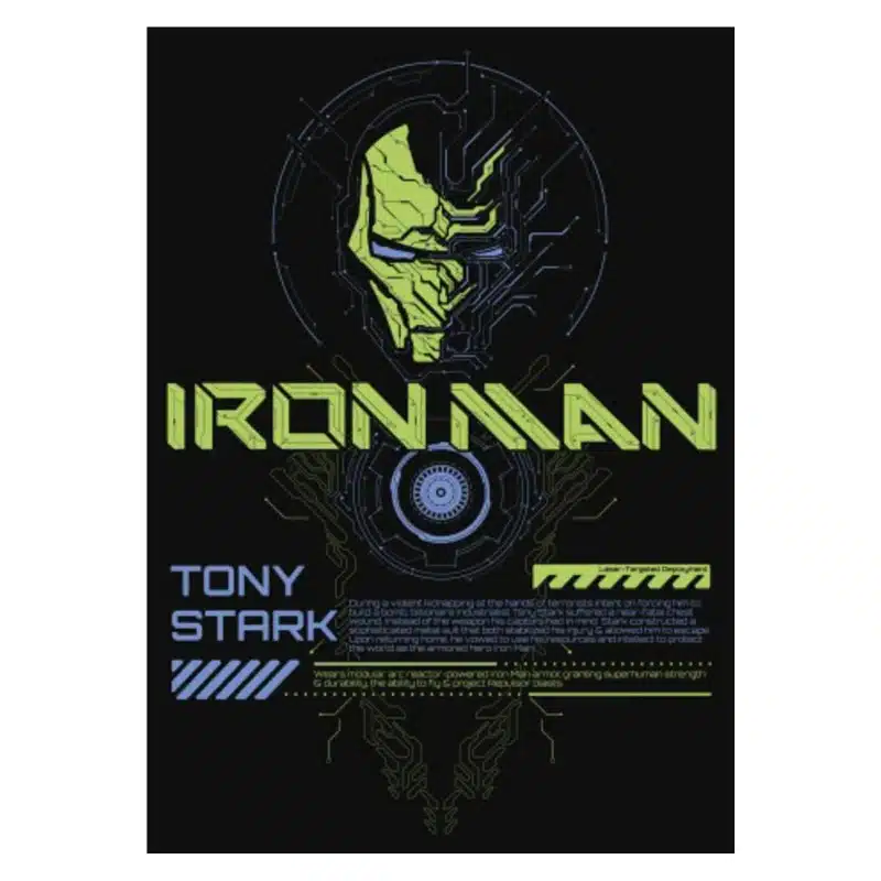 Marvel Iron Man Glow in the Dark poster donosi moderan, tehnološki dizajn inspiriran legendarnim likom Tonyja Starka. Poster prikazuje stilizirani prikaz Iron Man oklopa i arc reaktora uz futurističke detalje i “blueprint” estetiku.
