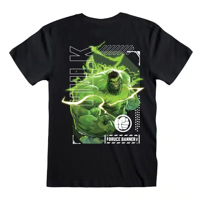 Majica prikazuje snažan vizual Hulka (Bruce Banner) sa efektima energije i modernim grafičkim elementima. Kontrast zelene grafike na crnoj podlozi daje upečatljiv i dinamičan izgled, idealan za casual kombinacije.