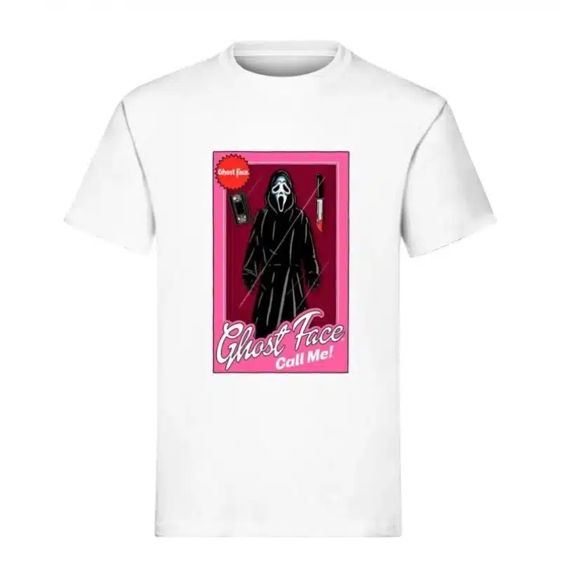 Na majici se nalazi stilizirani prikaz Ghost Facea u “lutka pakiranju” dizajnu, uz natpis “Call Me!”, što je referenca na poznate telefonske scene iz filmova. Uz lik su prikazani i detalji poput telefona i noža, koji dodatno naglašavaju horor tematiku.