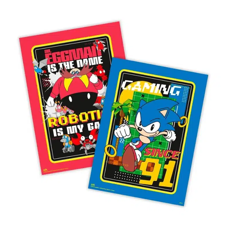 Sonic set od 2 postera (52 × 38 cm) donosi dva atraktivna motiva iz svijeta legendarnog plavog ježa. Jedan poster prikazuje Sonica u retro gaming stilu s natpisom “Gaming Since ’91”, dok drugi ističe njegovog protivnika Dr. Eggmana (Robotnik) u upečatljivom dizajnu.