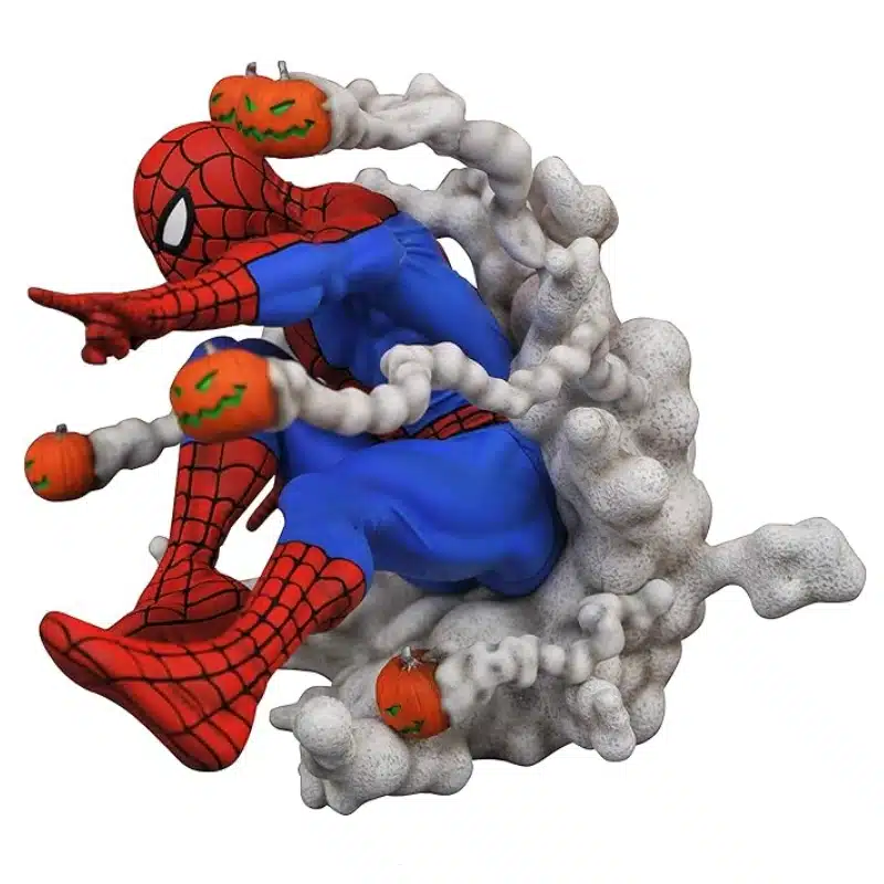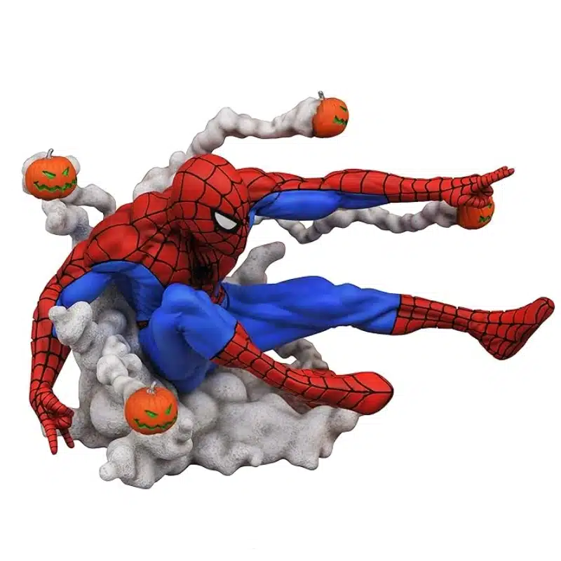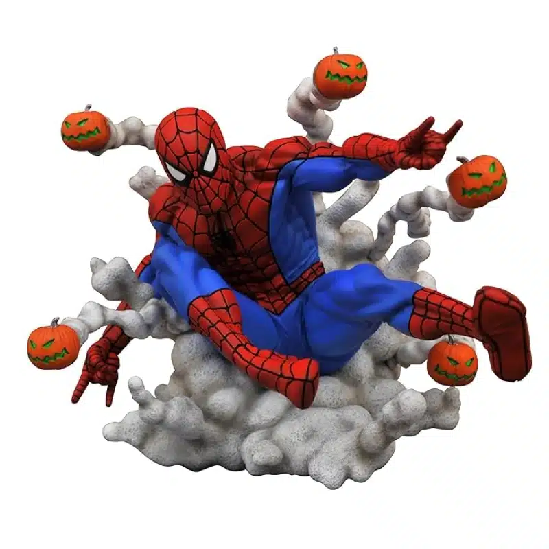 Spider-Man Pumpkin Bombs figurica visoka je približno 15 cm i izrađena od visokokvalitetnog PVC materijala. Ova detaljna diorama prikazuje Spider-Mana kako skače iz oblaka bundeva-bombi, koje je bacio jedan od njegovih goblinskih neprijatelja. Scena je dinamična i puna akcije, savršena za ljubitelje Marvela i kolekcionare.