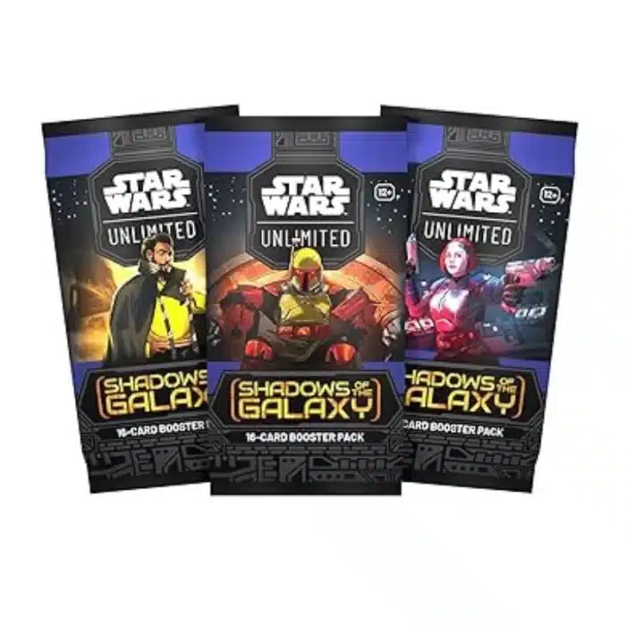 Star Wars Unlimited Shadows of the Galaxy Booster paketić englesko je izdanje službenog Star Wars: Unlimited TCG seta Shadows of the Galaxy, koje sadrži 16 nasumičnih karata s likovima, vozilima i taktikama iz rubnih dijelova galaksije