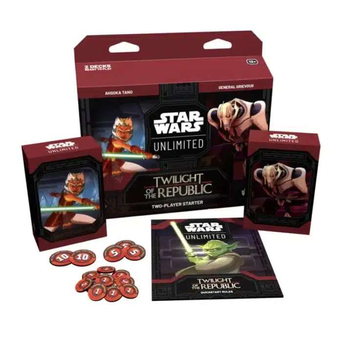 Star Wars Unlimited Twilight of the Republic Two-Player Starter Box Set englesko je izdanje početničkog proizvoda iz Star Wars: Unlimited TCG-a koji uključuje dva potpuno složena, odmah spremna za igru špila s vođama Ahsoka Tano i General Grievous, 10 ekskluzivnih karata koje ne dolaze u booster paketićima, te sve potrebne dodatke za učenje i igranje