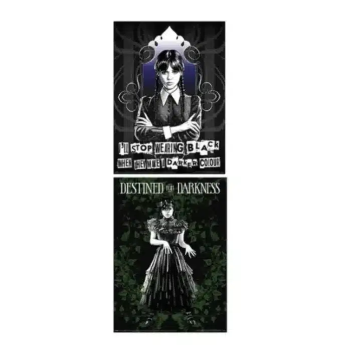 Wednesday set od 2 postera 52×38 cm s gotičkim dizajnom i kultnim citatima. Idealno za dekoraciju prostora s tamnom estetikom.
